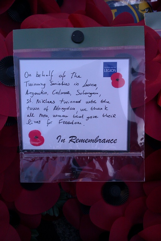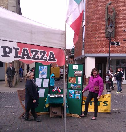 Journey to Abingdon, twinned town with Lucca, Tuscany, Italy (13/11/2014) A delegation of 10 Lucchesi has just returned from the UK, after a short stay in Abingdon, hosted by the ADTTS (twinning society) friends. The occasion this time was the Remembrance Day commemorations where both the ADTTS, represented by Stella Carter and the Lucchese delegation, represented by Maria Curto laid two wreaths of poppies at the war memorial. The ceremony was indeed moving, in a square full of people in sincere and respectful silence praying for all those soldiers who lost their lives for freedom. This year the Remembrance was particularly for the 100 year Anniversary of WW1(1914-2014). On Friday 7th of November Abingdon’s Mayor, Angela Lawrence, received the Italian visitors and their English hosting families and welcomed them most friendly. A second invitation came, this time directly from the Mayor, in occasion of the reception held by the Town Hall after the commemoration ceremony on Sunday the 9th. At this official event the Lucchese delegation could assist at the signature of an agreement of cooperation between the local Royal British Legion and the Town Hall of Abingdon to provide vital care and support to the Armed Forces community in need of help. Italian MarketSaturday 25 October 2014 - Market Place