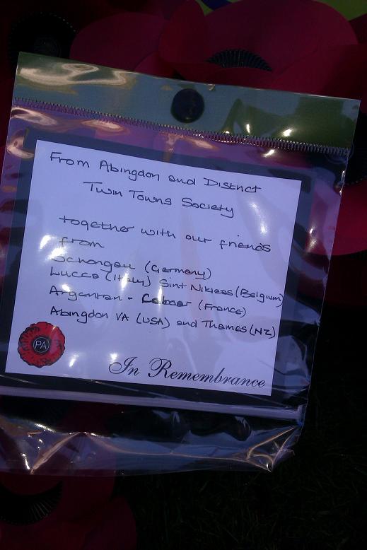 Remembrance SundaySunday 11 November 2012 - 11am at The Square Each year ADTTS invites a representative from one of our twin towns to join with us in Abingdon's annual act of remembrance. This year we welcomed from Schongau our friends Rutgar and Ursula von Grawert-May. Together with our chairman, Rutgar laid a wreath during the ceremony at the War Memorial with a message that translates as "As representative of the twin towns I lay down this cross to the memory of the fallen of both world wars - Rutgar v. Grawert-May".